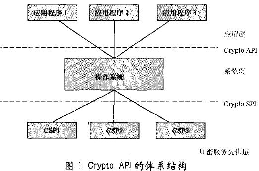 2.1智能卡與PC/SC規(guī)范 智能卡是一張內(nèi)含嵌入式集成電路芯片的信用卡般大小的塑料卡,具有儲(chǔ)存信息量大,數(shù)據(jù)保密性好,抗干擾能力強(qiáng),儲(chǔ)存可靠,讀寫(xiě)設(shè)備簡(jiǎn)單,使用靈活,操作速度快,脫機(jī)工作能力強(qiáng),易于攜帶等特點(diǎn)。本系統(tǒng)所使用的智能卡是一張?zhí)刂频膬?nèi)含有交換密鑰對(duì),簽名密鑰對(duì)和證書(shū)用以提供加解密、認(rèn)證等服務(wù)的電子卡。 PC/SC規(guī)范是一套為集成電路卡(ICC)與個(gè)人計(jì)算機(jī)系統(tǒng)設(shè)計(jì)進(jìn)行交互的規(guī)范,能夠讓智能卡方便地訪問(wèn)WindoW平臺(tái)。其主要優(yōu)點(diǎn)就是讓?xiě)?yīng)用程序不必為了與智能卡通信而去了解智能卡讀卡器的細(xì)節(jié),應(yīng)用程序通過(guò)PC/SC規(guī)范和智能卡讀卡器通信,后者再通過(guò)ISO7816與智能卡進(jìn)行通信來(lái)獲取智能卡提供的服務(wù),其傳輸?shù)陌Y(jié)構(gòu)是TPDU。 1.2 Crypto API體系結(jié)構(gòu)與CSP Crypto API是微軟提供的一套公共接口,包含了一系列的函數(shù),為應(yīng)用程序提供加解密、數(shù)字簽名、哈希等安全服務(wù),而應(yīng)用程序不必關(guān)心其具體實(shí)現(xiàn)。不同的供應(yīng)商可以開(kāi)發(fā)獨(dú)立的加密模塊,這些模塊成為加密服務(wù)提供者(Cryptographic Service Provider CSP),完成密鑰生成/交換、加解密、數(shù)字簽名、認(rèn)證等服務(wù)的真正模塊。微軟默認(rèn)的CSP是RSA Based Provider,使用RSA公司的加密算法。一個(gè)系統(tǒng)中可以加載多個(gè)CSP模塊,它們相互獨(dú)立。應(yīng)用程序可以使用任意一個(gè)CSP模塊,而不必關(guān)心它的具體實(shí)現(xiàn),每個(gè)CSP都對(duì)Crypto API進(jìn)行不同的實(shí)現(xiàn)。 Crypto API的體系結(jié)構(gòu)如圖1所示。